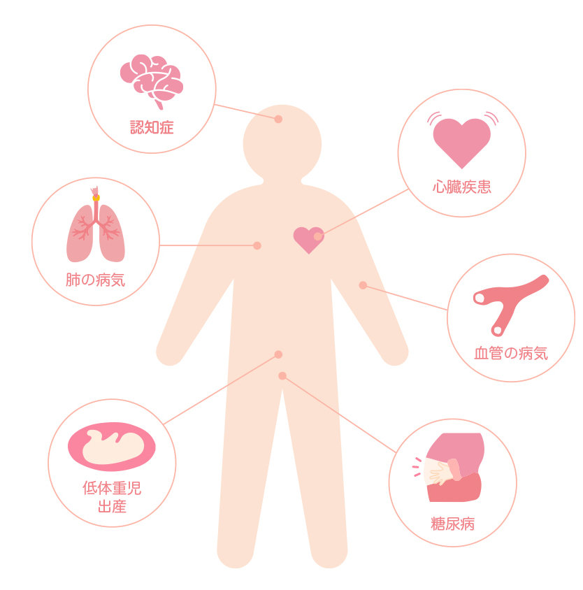 歯ぐきの毛細血管が出血すると、そこから歯周病菌が体内に入り込み、血液とともに全身を回ります。これにより、糖尿病、心臓疾患、動脈硬化など血管の病気、誤嚥性肺炎など肺の病気、低体重児出産などのリスクが高まることがわかっています。また、歯周病菌はアルツハイマー型認知症の原因となるアミロイドβの増加に関わりがあることも明らかになってきました。お口だけでなく、全身の健康のためにも、歯周病の予防と早期治療が望まれます。